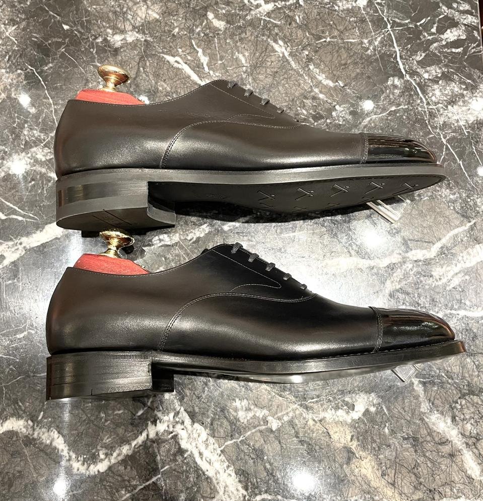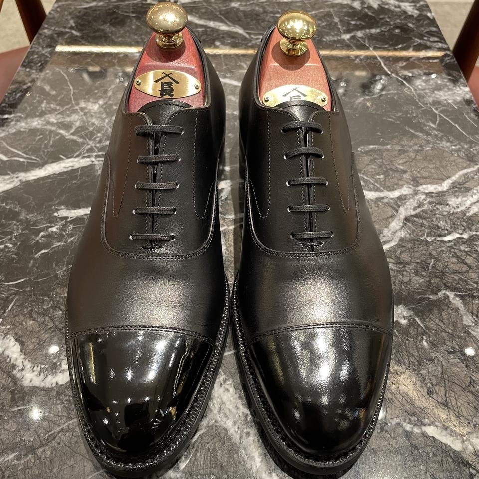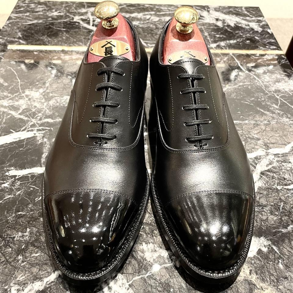 まずは、レザーソール革靴好きの皆さまの多くは言うに足らず、ご存知レザーソールに縫い目が見えないのは、ドブ伏せという技法を施しており、サイドからナイフで革を起こし縫い目が通る部分には溝を隠しいれ、美しくフラットな底面にし、靴界隈では通称「カラス」という真っ黒で品格のある仕上がりです。