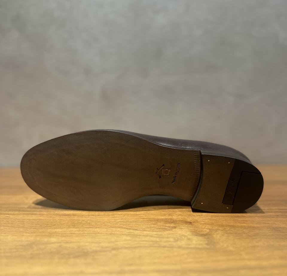 弥三郎はつま先にボリュームのあるスタイルですが、使用しているルビーカーフと絶妙なダークブラウンの色味により、カジュアル過ぎない雰囲気もあり、昨今のビジネスカジュアル化の進む状況であれば、様々なシーンでお履きいただけるのではないでしょうか。